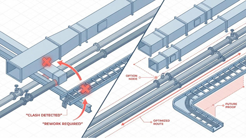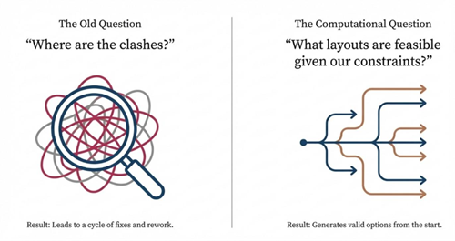 A shift is now emerging through computational design that reframes coordination as an early-stage decision process rather than a late-stage verification exercise. The central question changes from “Where are the clashes?” to “Which layouts are feasible given our constraints, and what trade-offs do they imply?”